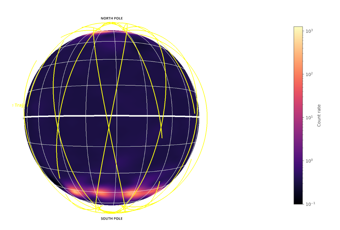 Eredményeink interpretációjához megjegyezzük, a Földet reprezentáló színes gömbön a vastag fehér vonalak a 0 fok szélességi és hosszúsági körök. A sárga görbék a HUNITY azon pályaszakaszai, ahol a Celeritas modul aktív mérési üzemmódba kapcsolt. Minél világosabb egy régió, annál nagyobb a beütésszám-sebesség.